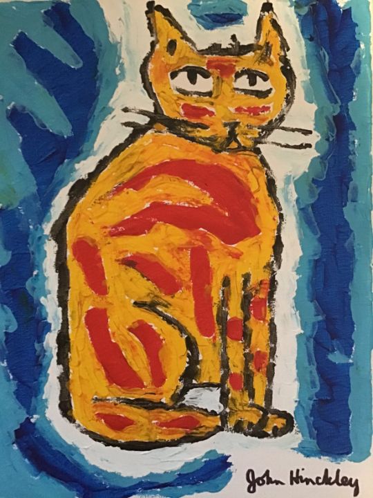 Central to John Hinckley Jr Artwork is his iconic cat series, featuring his pet in whimsical poses. The 2025 “Cat” oil on canvas—16×20 inches, listed at $250—showcases fluid lines and vibrant oranges.